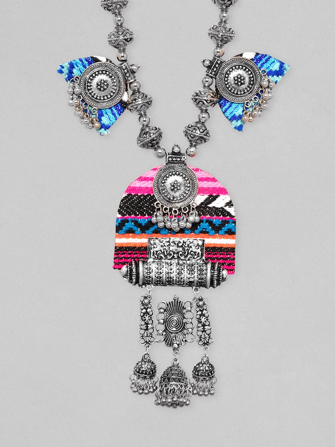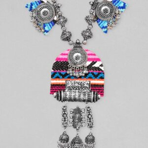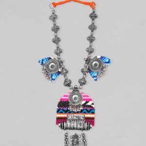 A necklace with a splash of colour and texture thanks to the fabric that makes it stand out. The artificial beads and use of multiple intricate designs to form the necklace ensures it looks like a mix of many elements that have come together. This boho necklace is complete with a drawstring made of threads. Occasion: This necklace is perfect for wearing when heading out to meet friends or on dates. Material & Care Dimension : Necklace 66 cm; Earring 3.5 cm Material : Brass Collection : Oxidized Weight : 30g Net Qnty : 1 Necklace Care Label : It is advisable to avoid contact with water and organic chemicals i.e. perfume sprays. Store jewellery in airtight box. After use, wipe the jewellery with soft cotton cloth.