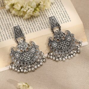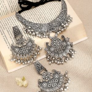 Jewellery Set : Embrace timeless elegance with oxidized silver-plated choker set featuring a crescent motif, detailed floral and geometric engravings, and layered silver beads for a bold ethnic look. Material & Care Length : Necklace : 15 cm ; Earrings : 9 cm Width : Necklace : 7 cm ; Earrings : 6 cm Material: Brass Net Quantity : 1 Necklace and 1 Pair of Earrings Collections : Oxidized Care Instruction : Wipe your jewellery with a soft cloth after every use. Always store your jewellery in a flat box to avoid accidental scratches. Keep sprays and perfumes away from your jewellery. Do not soak your jewellery in water. Clean your jewellery using a soft brush, dipped in jewellery cleaning solution only