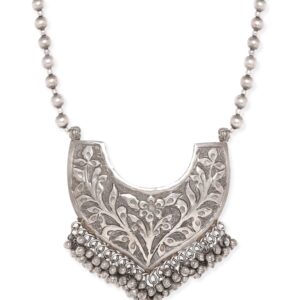 This statement pendant necklace is a versatile accessory that can enhance your ethnic or bohemian look. It’s perfect for special occasions or as an everyday piece to add a touch of culture and elegance to your outfit. The oxidized silver and ghungroo dangles make it a unique and eye-catching addition to your jewelry collection. Occasion : Bring your style to a whole new level with this handcrafted piece of jewellery. When you’re celebrating a special Occasion : – a birthday, wedding, or personal milestone – this piece adds that extra something that makes us feel special and looking our best. Material & Care Dimension : Length 80 cm Material : Alloy Care Label : It is advisable to avoid contact with water and organic chemicals i.e. perfume sprays. Store jewellery in airtight box. After use, wipe the jewellery with soft cotton cloth.