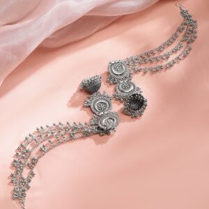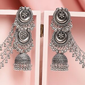 These oxidized silver-plated jhumkas by feature intricate ghungroo beads, a dome design, and a triple-layer hair chain, creating a bold and traditional statement piece for special occasions. Occasion : Bring your style to a whole new level with this handcrafted piece of jewellery. When you’re celebrating a special Occasion : – a birthday, wedding, festive or personal milestone – this piece adds that extra something that makes us feel special and looking our best. Material & Care Dimension : Length: 10 cm Width: 16 cm Material : Brass Collection : Oxidized Net Weight : 56.55 Gram Net Quantity : 1 pair of Earrings Care Label : It is advisable to avoid contact with water and organic chemicals i.e. perfume sprays. Store jewellery in airtight box. After use, wipe the jewellery with soft cotton cloth.