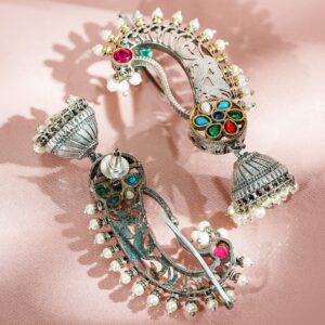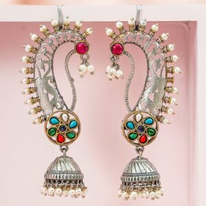 Ear Cuff Earrings : oxidized silver-plated brass oversized earcuff jhumka earrings in gold and silver tone with bird motif, ruby red stones, and pearl detailing, perfect for weddings and festive occasions. Perfect for Gifting & Styling: A timeless gift for weddings, anniversaries, festive celebrations, or parties—these earrings bring designer-worthy appeal for women & girls who love refined glamour. Material & Care Dimension : Length: 8 cm Dimension : Width: 3 cm Net Weight : 33.50 Gram Net Quantity : 1 pair of Ear cuff Earrings Material : Brass Care Label : It is advisable to avoid contact with water and organic chemicals i.e. perfume sprays. Store jewellery in airtight box. After use, wipe the jewellery with soft cotton cloth.