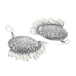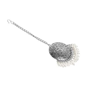 Maang Tika and Earrings Set : Elevate your traditional attire with this exquisite Oxidized Silver-Plated Maang Tikka and Earrings Set. Crafted with intricate oxidized silver work, the set is adorned with delicate white beads that add a touch of elegance. The classic round design, paired with the soft shimmer of the white beads, makes this set a perfect blend of traditional charm and modern appeal. Ideal for adding a graceful accent to any festive or special occasion, this set is a must-have in your jewelry collection. Occasion : Bring your style to a whole new level with this handcrafted piece of jewellery. When you’re celebrating a special Occasion : – a birthday, wedding, or personal milestone – this piece adds that extra something that makes us feel special and looking our best. Material : & Care Dimension : Size: Necklace : 7.5 cm, Earrings : 4 cm Material :Brass Care Label : It is advisable to avoid contact with water and organic chemicals i.e. perfume sprays. Store jewellery in airtight box. After use, wipe the jewellery with soft cotton cloth.