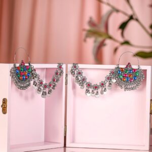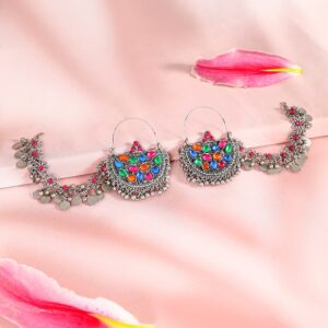 Ear Chain Earrings : These oxidized silver-plated chandbali earrings feature multicolored enamel with an intricate ear chain and floral detailing, blending ethnic charm with bold style. Occasion : Bring your style to a whole new level with this handcrafted piece of jewellery. When you’re celebrating a special Occasion : – a birthday, festive, wedding, or personal milestone – this piece adds that extra something that makes us feel special and looking our best. Material : & Care Dimension : Length : 7 cm ; Width : 5 cm Material : Brass