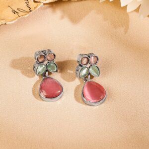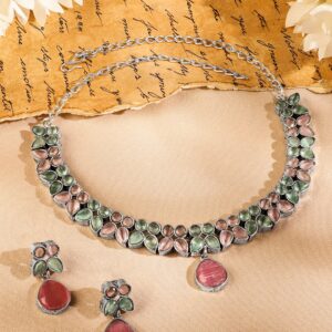 Jewellery Set : Oxidized silver-plated necklace set adorned with pastel pink and green kundan stones and matching drop earrings. A soft, statement-making piece perfect for elegant ethnic looks. Material & Care Length : Necklace : 12 cm ; Earrings : 1 cm Width : Necklace : 1 cm ; Earrings : 1.2 cm Material: Brass Net Weight : 39.71 Gram Net Quantity : 1 Necklace and 1 Pair of Earrings Collections : Oxidized Care Instruction : Wipe your jewellery with a soft cloth after every use. Always store your jewellery in a flat box to avoid accidental scratches. Keep sprays and perfumes away from your jewellery. Do not soak your jewellery in water. Clean your jewellery using a soft brush, dipped in jewellery cleaning solution only