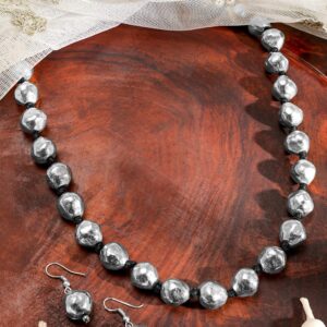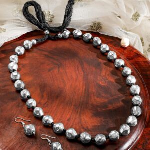 A bold statement set featuring oxidized silver-plated beads and matching earrings. The handcrafted finish and rustic charm make it a perfect choice for traditional or contemporary looks. Material & Care Dimension : Length – Necklace : 50 cm ; Earrings : 1 cm Width – Necklace : 4 cm ; Earrings : 1 cm Material : Brass Collection : Oxidized Weight : 92.08 Gram Net Qnty : 1 Necklace & 1 Pair of Earrings Care Label : It is advisable to avoid contact with water and organic chemicals i.e. perfume sprays. Store jewellery in airtight box. After use, wipe the jewellery with soft cotton cloth.