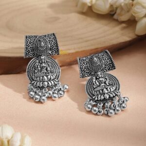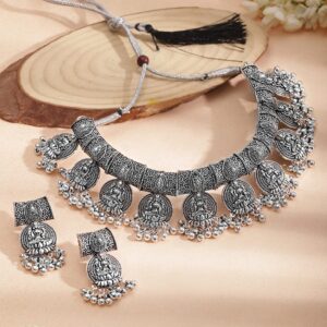 Necklace set: This oxidized silver-plated necklace set exudes traditional charm, featuring a striking design of engraved Goddess Lakshmi coin motifs adorned with intricate detailing. Accentuated with dangling silver beads, the necklace offers a bold, antique-inspired look, complemented by matching earrings that echo the same divine design. Perfect for adding a touch of cultural elegance, this set is ideal for pairing with ethnic attire to create a statement look. Occasion : Bring your style to a whole new level with this handcrafted piece of jewellery. When you’re celebrating a special Occasion : – a birthday, wedding, or personal milestone – this piece adds that extra something that makes us feel special and looking our best. Material : & Care Dimension :Size : Necklace & Earrings : Length : 20 cm / 4 cm Width : 4 cm / 2 cm Material : Brass Care Label : It is advisable to avoid contact with water and organic chemicals i.e. perfume sprays. Store jewellery in airtight box. After use, wipe the jewellery with soft cotton cloth.