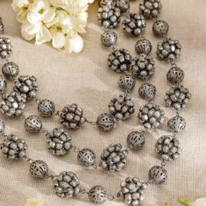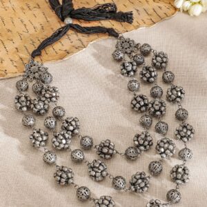 Necklace : Make a bold statement with this triple-layered oxidised silver-plated necklace from , featuring intricately designed floral beads. The layered style and antique finish bring a touch of traditional elegance, perfect for complementing ethnic and fusion attire with grace. Perfect for Festive and Cultural Events: Ideal for weddings, festivals, and traditional gatherings, this necklace enhances both sarees and fusion wear effortlessly. Material & Care Material: Brass Size & Fit : Length : 30 cm ; Width : 3 cm Net Weight : 52.78 Gram Plating: Silver plated Stone Type: Artificial Beads Net Quantity : 1 Necklace Care Label : It is advisable to avoid contact with water and organic chemicals i.e. perfume sprays. Store jewellery in airtight box. After use, wipe the jewellery with soft cotton cloth.