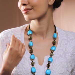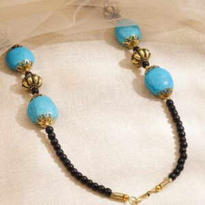 This vibrant necklace features turquoise blue textured beads, antique gold accents, and black traditional beads. A bold yet graceful choice for ethnic and everyday fusion looks. Material & Care Dimension : Necklace : 37 cm ; Width : 2.5 cm Material: Brass Collection : Beaded Net Weight: 14.74 gram Net Quantity: 1 Necklace Care Label: It is advisable to avoid contact with water and organic chemicals i.e. perfume sprays. Store jewellery in airtight box. After use, wipe the jewellery with soft cotton cloth.
