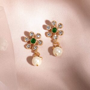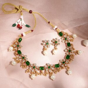 Jewellery Set : This exquisite necklace set features a luxurious 22K gold-plated design adorned with vibrant emerald and sparkling zirconia stones. The intricate gold and pearl beading adds a touch of elegance, making it perfect for special occasions. This premium set is a timeless addition to any jewelry collection, offering a blend of traditional charm and modern sophistication. Occasion : Bring your style to a whole new level with this handcrafted piece of jewellery. When you’re celebrating a special Occasion : – a birthday, wedding, or personal milestone – this piece adds that extra something that makes us feel special and looking our best. Material : & Care Dimension : Size : Length : 21 cm, Width : 3,5 cm Material: Brass Net Weight: 44.79 Gram Net Quantity: 1 Necklace & 1 Pair of Earrings Care Label: It is advisable to avoid contact with water and organic chemicals i.e. perfume sprays. Store jewellery in airtight box. After use, wipe the jewellery with soft cotton cloth.
