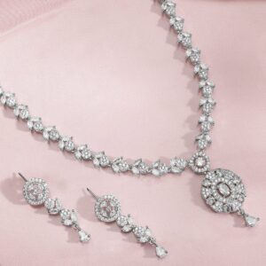 Be the first to review “Premium Rhodium Plated White Cubic Zirconia Studded Necklace Set with Floral Design – Silver”