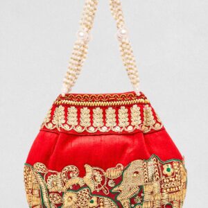 Handbags : Discover the elegance of Red Embroidered & Green Border Potli Bag with Pearl Handle & Elephant Motif Details. This piece combines quality craftsmanship with a timeless design, making it perfect for any occasion. Elevate your style effortlessly and enjoy compliments on your refined taste. A must-have addition to your jewelry collection. Occasion : Bring your style to a whole new level with this handcrafted piece of jewellery. When you’re celebrating a special Occasion : – a birthday, wedding, or personal milestone – this piece adds that extra something that makes us feel special and looking our best. Material : & Care Dimension : Handbags Size :Length : 32 cm Material :Brass Weight : 135.46g Net Qnty : 1 Bag Care Label : It is advisable to avoid contact with water and organic chemicals i.e. perfume sprays. Store jewellery in airtight box. After use, wipe the jewellery with soft cotton cloth.