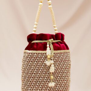 Be the first to review “Red Velvet Potli Bag with Pearl Handle, Golden Embroidery & Stone Detailing”