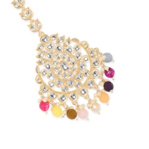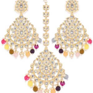 The blend of traditional kundan work with the classic beauty of pearls creates a piece that exudes sophistication and grace. Treat yourself or a loved one to these truly special earrings that will be cherished for years to come. Embrace the allure of fine craftsmanship and radiant beauty with these exquisite earrings. Occasion : Bring your style to a whole new level with this handcrafted piece of jewellery. When you’re celebrating a special Occasion : – a birthday, wedding, or personal milestone – this piece adds that extra something that makes us feel special and looking our best. Material & Care Dimension : Earrings 8 cm; Maang Tikka 17 cm Material : Brass Collection : Kundan Weight : 71.03g Net Qnty : 1 Maang Tikka, 1 Pair of Earrings Care Label : It is advisable to avoid contact with water and organic chemicals i.e. perfume sprays. Store jewellery in airtight box. After use, wipe the jewellery with soft cotton cloth.