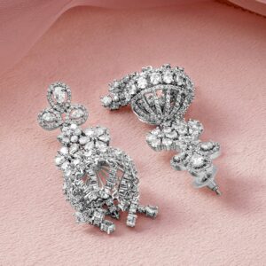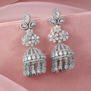 Earrings : These exquisite rhodium-plated jhumka earrings feature a stunning floral design adorned with dazzling AAA cubic zirconia stones. The intricate craftsmanship and shimmering details make them a perfect choice for adding a touch of elegance to any wedding look Occasion : Bring your style to a whole new level with this handcrafted piece of jewellery. When you’re celebrating a special Occasion : – a birthday, wedding, or personal milestone – this piece adds that extra something that makes us feel special and looking our best. Material : & Care Dimension : Size : Length : 6.5 cm, Width : 2.2 cm Material :Brass Care Label : It is advisable to avoid contact with water and organic chemicals i.e. perfume sprays. Store jewellery in airtight box. After use, wipe the jewellery with soft cotton cloth.