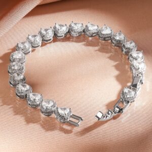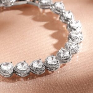 Bracelet : A luxurious rhodium-plated bracelet featuring heart-shaped AAA cubic zirconia stones in a sleek tennis design. Its dazzling brilliance and refined craftsmanship make it a timeless piece. Occasion : Bring your style to a whole new level with this handcrafted piece of jewellery. When you’re celebrating a special Occasion : – a birthday, wedding, or personal milestone – this piece adds that extra something that makes us feel special and looking our best. Material : & Care Dimension : Length : 18.3 cm, Width: 0.7 cm Net Weight: 18.12 g Net Quantity : 1 Bracelet Material :Brass Care Label : It is advisable to avoid contact with water and organic chemicals i.e. perfume sprays. Store jewellery in airtight box. After use, wipe the jewellery with soft cotton cloth.