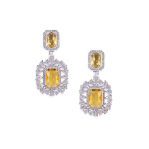 Illuminate your style with our Premium Rhodium-plated AAA Cubic Zirconia Yellow Sapphire Statement Dangle Earrings. The radiant yellow sapphire-inspired stones exude a vibrant charm, while the sophisticated design adds a touch of glamour. Elevate your look with these statement earrings, perfect for making a dazzling impression at any event Material & Care Dimension : Earrings : 3 cm Material: Brass Net Weight: 38.2 Gram Net Quantity: 1 Pair of Earrings Care Label: It is advisable to avoid contact with water and organic chemicals i.e. perfume sprays. Store jewellery in airtight box. After use, wipe the jewellery with soft cotton cloth.