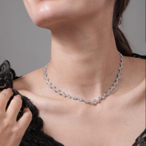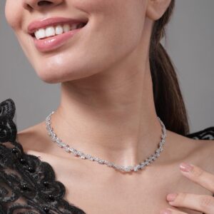 Necklace and Chains : This Rhodium Plated Tennis Necklace is an embodiment of elegance and style, featuring a unique cross link design studded with dazzling AD & Cubic Zirconia stones. The intricate pattern of linked crosses adds a contemporary twist to the classic tennis necklace, making it a versatile piece for both everyday wear and special occasions. The high-quality rhodium plating ensures a long-lasting shine and a polished finish, while the precisely cut stones reflect light beautifully, adding a touch of sparkle to your neckline. A timeless accessory that complements any outfit with grace and sophistication. Occasion : Bring your style to a whole new level with this handcrafted piece of jewellery. When you’re celebrating a special Occasion : – a birthday, wedding, or personal milestone – this piece adds that extra something that makes us feel special and looking our best. Material : & Care Dimension : Size : Length : 22 cm, Width : 0.5 cm Material :Brass Care Label : It is advisable to avoid contact with water and organic chemicals i.e. perfume sprays. Store jewellery in airtight box. After use, wipe the jewellery with soft cotton cloth.