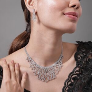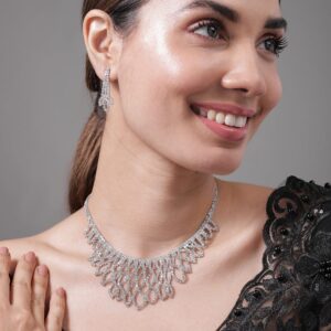 Jewellery Set : This Rhodium Plated AD & Cubic Zirconia Studded Luxurious Necklace Set features an exquisite leaf motif design that exudes elegance and sophistication. The intricate leaf patterns are beautifully adorned with sparkling cubic zirconia stones, creating a stunning visual effect that catches the light from every angle. The rhodium plating ensures a lasting shine and tarnish resistance, making this set a timeless addition to your jewelry collection. Ideal for special occasions, this necklace set is perfect for those who appreciate fine craftsmanship and luxurious designs. Occasion : Bring your style to a whole new level with this handcrafted piece of jewellery. When you’re celebrating a special Occasion : – a birthday, wedding, or personal milestone – this piece adds that extra something that makes us feel special and looking our best. Material : & Care Dimension : Size : Length : 22 cm, Width : 4.5 cm Material :Brass Care Label : It is advisable to avoid contact with water and organic chemicals i.e. perfume sprays. Store jewellery in airtight box. After use, wipe the jewellery with soft cotton cloth.