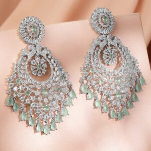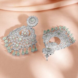 Earrings : These rhodium-plated chandelier earrings feature intricate AD and mint green cubic zirconia stones with a statement-making design, perfect for glamorous and elegant looks. Occasion : Bring your style to a whole new level with this handcrafted piece of jewellery. When you’re celebrating a special Occasion : – a birthday, wedding, or personal milestone – this piece adds that extra something that makes us feel special and looking our best. Material : & Care Dimension : Length : 9.5 cm , Width: 4.5 cm Net Weight: 28.75 g Net Quantity : 1 Pair Of Earrings Material :Brass Care Label : It is advisable to avoid contact with water and organic chemicals i.e. perfume sprays. Store jewellery in airtight box. After use, wipe the jewellery with soft cotton cloth.