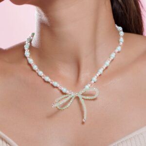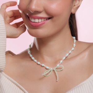 Necklace and Chains : This Rhodium Plated necklace is a blend of elegance and subtle charm, featuring a combination of aqua green and white beads that create a refreshing look. The necklace is highlighted by a delicate mint green bow pendant, adding a whimsical touch to its design. Perfect for enhancing your outfit with a graceful and unique accent, this necklace offers a sophisticated yet playful vibe, ideal for any occasion. Occasion : Bring your style to a whole new level with this handcrafted piece of jewellery. When you’re celebrating a special Occasion : – a birthday, wedding, or personal milestone – this piece adds that extra something that makes us feel special and looking our best. Material : & Care Dimension : Size : Length : 48 cm, Width : 6 cm Material :Brass Weight : 14.14g Net Qnty : 1 Necklace Care Label : It is advisable to avoid contact with water and organic chemicals i.e. perfume sprays. Store jewellery in airtight box. After use, wipe the jewellery with soft cotton cloth.