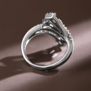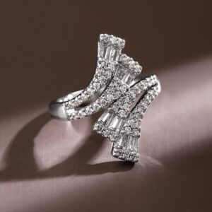 Ring : Make a statement with this rhodium-plated adjustable openable ring, featuring baguette and pavé cubic zirconia in a modern dual-layered design, exuding elegance and luxury. Occasion : Bring your style to a whole new level with this handcrafted piece of jewellery. When you’re celebrating a special Occasion : – a birthday, wedding, or personal milestone – this piece adds that extra something that makes us feel special and looking our best. Material : & Care Dimension : Size : 6 Net Weight: 4.40 g Net Quantity : 1Ring Material :Brass Care Label : It is advisable to avoid contact with water and organic chemicals i.e. perfume sprays. Store jewellery in airtight box. After use, wipe the jewellery with soft cotton cloth.