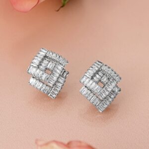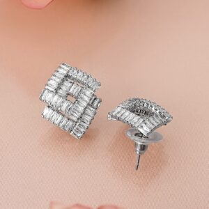 Earrings : These diamond-shaped stud earrings are rhodium-plated and intricately studded with clear baguette-cut cubic zirconia, offering a brilliant and structured modern look. Perfect for Modern Looks: Ideal for parties, formal gatherings, or contemporary fashion edits, these studs are a great way to add modern minimal glam to your ensemble with clean lines and sparkling depth. Material : & Care Dimension : Length 3 cm ; Width : 1.5 cm Net Weight : 25 Gram Material : Brass Net Quantity : 1 Pair of Earrings Care Label : It is advisable to avoid contact with water and organic chemicals i.e. perfume sprays. Store jewellery in airtight box. After use, wipe the jewellery with soft cotton cloth.