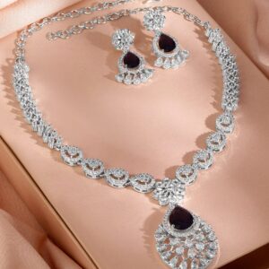 Jewellery Set : This rhodium-plated necklace set features bold black onyx AD stones and dazzling cubic zirconia, paired with matching earrings. A luxurious statement piece for any occasion. Occasion : Bring your style to a whole new level with this handcrafted piece of jewellery. When you’re celebrating a special Occasion : – a birthday, wedding, or personal milestone – this piece adds that extra something that makes us feel special and looking our best. Material : & Care Dimension : Length : NS- 21 ; E-3.2 cm, Width: NS- 2.5 ; E- 1.2 W Net Quantity : 1 Necklace & 2 Earrings Net Weight: 36.20 g Material :Brass Care Label : It is advisable to avoid contact with water and organic chemicals i.e. perfume sprays. Store jewellery in airtight box. After use, wipe the jewellery with soft cotton cloth.