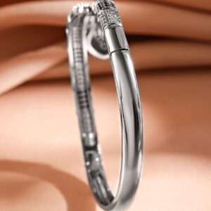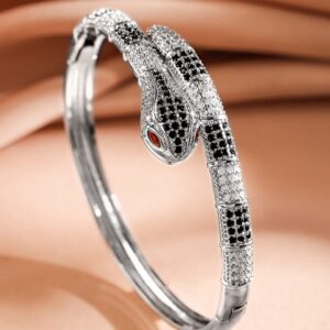 Bracelet : A striking rhodium-plated openable bracelet featuring a bold snake design. Embellished with black and white cubic zirconia and red eyes, this demi-fine piece exudes elegance and mystery Occasion : Bring your style to a whole new level with this handcrafted piece of jewellery. When you’re celebrating a special Occasion : – a birthday, wedding, or personal milestone – this piece adds that extra something that makes us feel special and looking our best. Material : & Care Dimension : Length : 6.5 cm, Width: 1.7 cm Net Weight: 19.83 g Net Quantity : 1 Bracelet Material :Brass Care Label : It is advisable to avoid contact with water and organic chemicals i.e. perfume sprays. Store jewellery in airtight box. After use, wipe the jewellery with soft cotton cloth.