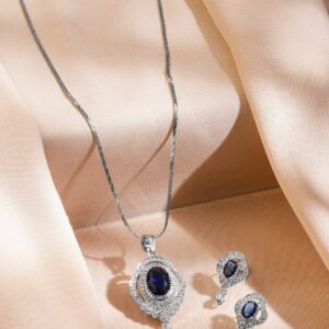 Pendent Set : This luxurious rhodium-plated pendant necklace set features a deep blue sapphire stone surrounded by dazzling white cubic zirconia, designed to make a grand statement for parties and special occasions. Occasion Ready Look : This glamorous set is perfect for cocktail nights, evening parties, formal gatherings, and special celebrations where you want to leave a lasting impression. Material & Care Dimension : Length : 27 cm ; Earrings Length : 2.5 cm Necklace Width: 2.5 cm ; Earrings Width : 1.5 cm Plating : Rhodium Plated Net Quantity : 1 Pendent & 1 Pair of Earrings Net Weight: 17.60 Gram Material : Brass Care Label : It is advisable to avoid contact with water and organic chemicals i.e. perfume sprays. Store jewellery in airtight box. After use, wipe the jewellery with soft cotton cloth.