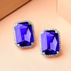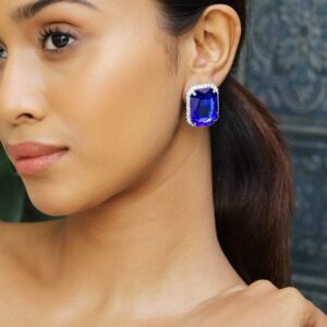 Earrings : Elevate your style with these rhodium-plated studs earrings featuring a royal blue sapphire centerpiece and a dazzling cubic zirconia halo, perfect for a timeless, luxurious look. Occasion : Bring your style to a whole new level with this handcrafted piece of jewellery. When you’re celebrating a special Occasion : – a birthday, wedding, or personal milestone – this piece adds that extra something that makes us feel special and looking our best. Material : & Care Dimension : Length : 2.9 cm, Width: 2.6 cm Net Weight: 16.35 g Net Quantity : 1 Pair Of Earrings Material :Brass Care Label : It is advisable to avoid contact with water and organic chemicals i.e. perfume sprays. Store jewellery in airtight box. After use, wipe the jewellery with soft cotton cloth.