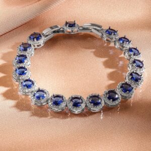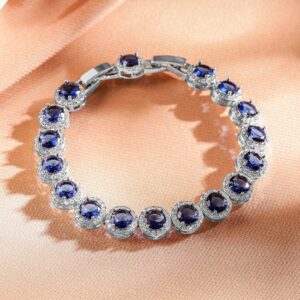 Bracelet :This exquisite rhodium-plated tennis bracelet features stunning blue sapphire gemstones encircled by dazzling cubic zirconia. The elegant design and high-polish finish add a touch of luxury, making it a perfect statement accessory for any occasion. Occasion : Bring your style to a whole new level with this handcrafted piece of jewellery. When you’re celebrating a special Occasion : – a birthday, wedding, or personal milestone – this piece adds that extra something that makes us feel special and looking our best. Material : & Care Dimension : Length : 18 cm, Width: 0.8 cm Net Weight: 15.20g Net Quantity : 1 Bracelet Material :Brass Care Label : It is advisable to avoid contact with water and organic chemicals i.e. perfume sprays. Store jewellery in airtight box. After use, wipe the jewellery with soft cotton cloth.