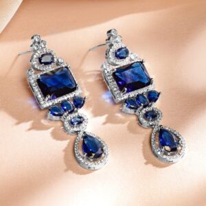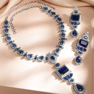 Necklace Set : An opulent jewellery set featuring pear and emerald-cut blue sapphire stones, encased in dazzling white cubic zirconia. The intricate detailing and rhodium-plated finish add an unmatched brilliance to this statement set. Occasion : Bring your style to a whole new level with this handcrafted piece of jewellery. When you’re celebrating a special Occasion : – a birthday, wedding, or personal milestone – this piece adds that extra something that makes us feel special and looking our best. Material : & Care Dimension : Size : Neckace : 42 cm, Earrings : 2 cm Net Quantity : 1 Necklace & 2 Earrings Net Weight: 72 g Material :Brass Care Label : It is advisable to avoid contact with water and organic chemicals i.e. perfume sprays. Store jewellery in airtight box. After use, wipe the jewellery with soft cotton cloth.