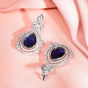Earrings : These Rhodium-Plated drop earrings feature a teardrop design with a bold blue sapphire center and shimmering white cubic zirconia. A perfect match for festive outfits, parties & special occasions. Occasion : Bring your style to a whole new level with this handcrafted piece of jewellery. When you’re celebrating a special Occasion : – a birthday, wedding, festive or personal milestone – this piece adds that extra something that makes us feel special and looking our best. Material & Care Dimension : Length : 5 cm, Width: 3 cm Net Weight: 19.80 g Net Quantity : 1 Pair Of Earrings Material :Brass Care Label : It is advisable to avoid contact with water and organic chemicals i.e. perfume sprays. Store jewellery in airtight box. After use, wipe the jewellery with soft cotton cloth.