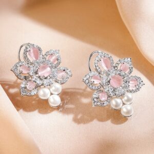 Earrings : These rhodium-plated floral studs feature blush pink stones, white Cubic Zirconia, and pearl drops—perfect for festive celebrations, elegant events, and sophisticated ethnic or western looks. Perfect for Occasions: A great choice for weddings, festive events, or formal gatherings, these earrings pair beautifully with sarees, lehengas, and gowns to create an effortlessly elegant look. Material : & Care Dimension : Length : 3.5 cm ; Width: 3 cm Net Weight: 12.24 Gram Net Quantity : 1 Pair Of Earrings Material : Brass Care Label : It is advisable to avoid contact with water and organic chemicals i.e. perfume sprays. Store jewellery in airtight box. After use, wipe the jewellery with soft cotton cloth.