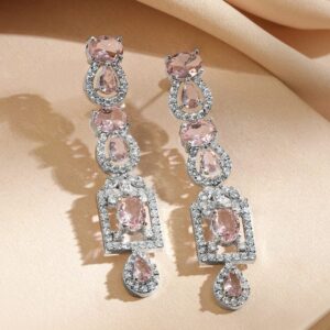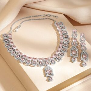Jewellery Set : This rhodium-plated premium necklace set features blush pink stones, Cubic Zirconia detailing, and matching long earrings—ideal for festive events, bridal wear, and luxurious statement occasions. Perfect for Occasions: Ideal for brides, cocktail nights, receptions, and festive occasions, this statement necklace and long earring set complements lehengas, gowns, or sarees with opulent elegance. Material & Care Dimension : Length : Necklace : 12 cm, Earrings : 6 cm Dimension : Width : Necklace : 1.5 cm, Earrings : 1.5 cm Net Weight : 50.18 Gram Net Quantity : 1 Necklace & 1 Pair of Earrings Material : Brass Care Label : It is advisable to avoid contact with water and organic chemicals i.e. perfume sprays. Store jewellery in airtight box. After use, wipe the jewellery with soft cotton cloth.