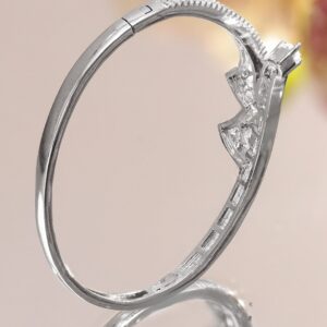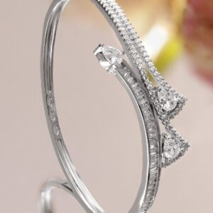 Bracelet – Rhodium-plated bracelet featuring dual rows of round stones with pear-cut Cubic Zirconia accents, offering timeless elegance for daily, party, and festive wear. Versatile & Statement-Worthy: Perfectly suited for festive wear, special occasions, and elegant evening looks—it brings a graceful charm to any ensemble. Material : & Care Dimension : Length: 6 cm ; Width: 1.2 cm Material: Brass Net Weight: 10.8 Gram Net Quantity: 1 Bracelet Type : Openable Bracelet Care Label: It is advisable to avoid contact with water and organic chemicals i.e. perfume sprays. Store jewellery in airtight box. After use, wipe the jewellery with soft cotton cloth.