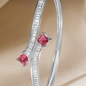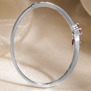 Bracelet – This rhodium-plated bracelet features a graceful curved design with two ruby red stones and clear cubic zirconia accents, crafted in premium brass for a refined, luxurious finish. Versatile & Statement-Worthy: Perfectly suited for festive wear, special occasions, and elegant evening looks—it brings a graceful charm to any ensemble. Material : & Care Dimension : Length: 2.6 cm ; Width: 2 cm Material: Brass Net Weight: 10.87 Gram Net Quantity: 1 Bracelet Type : Openable Bracelet Care Label: It is advisable to avoid contact with water and organic chemicals i.e. perfume sprays. Store jewellery in airtight box. After use, wipe the jewellery with soft cotton cloth.
