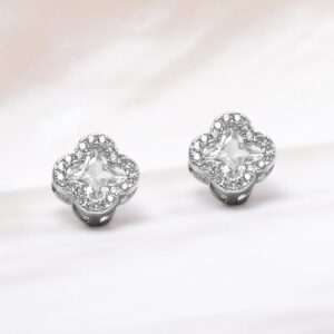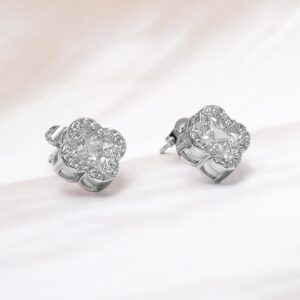 Earrings : Elevate your elegance with these exquisite rhodium-plated stud earrings, featuring a unique clover design. Each earring is beautifully adorned with a sparkling cubic zirconia center, surrounded by a delicate halo of smaller stones that add a touch of brilliance. Perfect for adding a subtle yet sophisticated sparkle to your daily look or enhancing your evening attire, these stud earrings are a versatile and timeless addition to your jewelry collection. Designed for comfort and style, they offer a refined touch of luxury. Occasion : Bring your style to a whole new level with this handcrafted piece of jewellery. When you’re celebrating a special Occasion : – a birthday, wedding, or personal milestone – this piece adds that extra something that makes us feel special and looking our best. Material : & Care Dimension : Size : Length : 2.3 cm, Width : 2.3 cm Material :Brass Care Label : It is advisable to avoid contact with water and organic chemicals i.e. perfume sprays. Store jewellery in airtight box. After use, wipe the jewellery with soft cotton cloth.