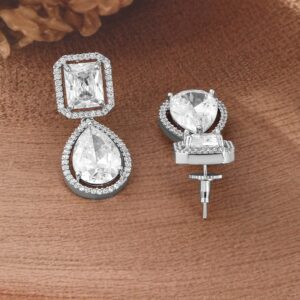 Earrings : Discover the elegance of Rhodium Plated Crystal AD & Cubic Zirconia Studded Drop Earrings – Elegant Design. This piece combines quality craftsmanship with a timeless design, making it perfect for any occasion. Elevate your style effortlessly and enjoy compliments on your refined taste. A must-have addition to your jewelry collection. Occasion : Bring your style to a whole new level with this handcrafted piece of jewellery. When you’re celebrating a special Occasion : – a birthday, wedding, or personal milestone – this piece adds that extra something that makes us feel special and looking our best. Material : & Care Dimension : Earrings Size :Length : 1.2 cm, Width : 1.2 cm Material :Brass Care Label : It is advisable to avoid contact with water and organic chemicals i.e. perfume sprays. Store jewellery in airtight box. After use, wipe the jewellery with soft cotton cloth.