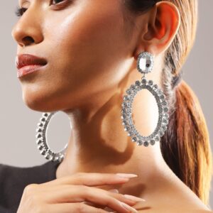 Earrings : These rhodium-plated statement earrings feature a crystal AD & cubic zirconia-studded oval design, exuding sophistication and glamour, making them perfect for evening parties and special occasions. Occasion : Bring your style to a whole new level with this handcrafted piece of jewellery. When you’re celebrating a special Occasion : – a birthday, wedding, or personal milestone – this piece adds that extra something that makes us feel special and looking our best. Material : & Care Dimension : Length : 9.5 cm, Width: 4.5 w Net Weight: 30.32 g Net Quantity : 1 Pair Of Earrings Material :Brass Care Label : It is advisable to avoid contact with water and organic chemicals i.e. perfume sprays. Store jewellery in airtight box. After use, wipe the jewellery with soft cotton cloth.