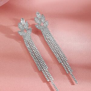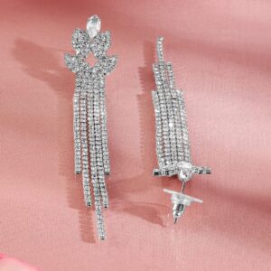 Earrings : These Rhodium-Plated Crystal Dangle Tassel Earrings feature sparkling crystals arranged in a cascading tassel design. The rhodium-plated finish adds a modern, chic touch, perfect for a glamorous and elegant look. Occasion : Bring your style to a whole new level with this handcrafted piece of jewellery. When you’re celebrating a special Occasion : – a birthday, wedding, or personal milestone – this piece adds that extra something that makes us feel special and looking our best. Material : & Care Dimension : Length : 9.5 cm, Width: 1.5 cm Net Weight: 15.84 g Net Quantity : 1 Pair Of Earrings Material :Brass Care Label : It is advisable to avoid contact with water and organic chemicals i.e. perfume sprays. Store jewellery in airtight box. After use, wipe the jewellery with soft cotton cloth.