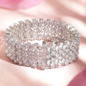 This classic bracelet features meticulously set round zirconia stones, exuding understated elegance and grace. The rhodium-plated finish not only enhances the brilliance of the stones but also ensures durability. Elevate your wrist with the classic charm of this demi-fine tennis bracelet, perfect for any occasion where you want to radiate timeless beauty. Material & Care Dimension : Free Size Material: Brass Net Weight: 30 Gram Net Quantity: 1 Bracelet Care Label: It is advisable to avoid contact with water and organic chemicals i.e. perfume sprays. Store jewellery in airtight box. After use, wipe the jewellery with soft cotton cloth.