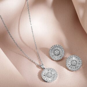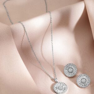 Jewellery Set : The Rhodium-Plated Crystal Necklace and Earrings set features sparkling crystals set in rhodium-plated metal, offering a chic, elegant design perfect for adding a touch of glamour to any outfit. Occasion : Bring your style to a whole new level with this handcrafted piece of jewellery. When you’re celebrating a special Occasion : – a birthday, wedding, or personal milestone – this piece adds that extra something that makes us feel special and looking our best. Material : & Care Dimension : Size : Necklace : 25 cm, Earrings : 1.7 cm Net Weight:80g Net Quantity : 1 necklace & 2 Earrings Material : Care Label : It is advisable to avoid contact with water and organic chemicals i.e. perfume sprays. Store jewellery in airtight box. After use, wipe the jewellery with soft cotton cloth.