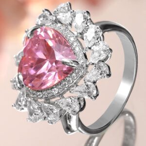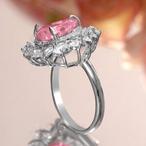 Ring : rhodium-plated brass ring with a crystal pink heart-shaped Cubic Zirconia, encircled by sparkling stones in a radiant halo. Adjustable fit, ideal for weddings, parties & festive occasions. Perfect for Elegant Styling: Whether paired with ethnic or western attire, this statement ring adds glamour and grace, ideal for cocktail events, festive gatherings, and special celebrations. Material : & Care Dimension : Ring Size : 6 Size Material : Brass Net Quantity : 1 Ring Net Weight : 22 Gram Care Label : It is advisable to avoid contact with water and organic chemicals i.e. perfume sprays. Store jewellery in airtight box. After use, wipe the jewellery with soft cotton cloth.
