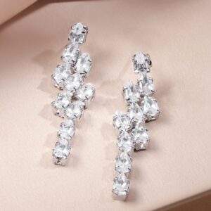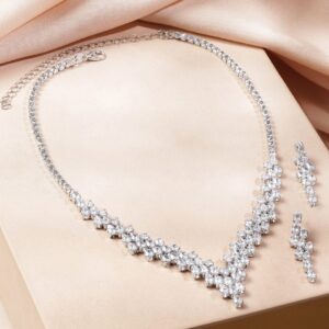 Jewellery Set : rhodium-plated brass necklace set with crystal white AD stones and cubic zirconia in a V-shaped design, perfect for parties, weddings, and special occasions. Occasion Perfect: Ideal for parties, dinner dates, weddings, and special evenings, adding timeless sophistication. Material : & Care Dimension : Length : 32 cm / 3.5 cm, Width: 1.5 cm / 1.5 cm Material : Brass Weight : 52.78 Gram Net Qnty : 1 Necklace, 1 Pair of Earrings Care Label : It is advisable to avoid contact with water and organic chemicals i.e. perfume sprays. Store jewellery in airtight box. After use, wipe the jewellery with soft cotton cloth.