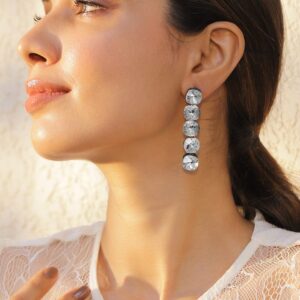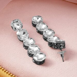 Earrings : These elegant drop earrings feature a rhodium-plated design, beautifully studded with sparkling crystal zirconia stones. The sleek and sophisticated style makes them a perfect statement piece for any occasion, adding a touch of glamour to your look. Crafted for those who appreciate timeless elegance, these earrings are sure to dazzle. Occasion : Bring your style to a whole new level with this handcrafted piece of jewellery. When you’re celebrating a special Occasion : – a birthday, wedding, or personal milestone – this piece adds that extra something that makes us feel special and looking our best. Material : & Care Dimension : Size : Length : 6 cm, Width : 1.5 cm Material :Brass Care Label : It is advisable to avoid contact with water and organic chemicals i.e. perfume sprays. Store jewellery in airtight box. After use, wipe the jewellery with soft cotton cloth.