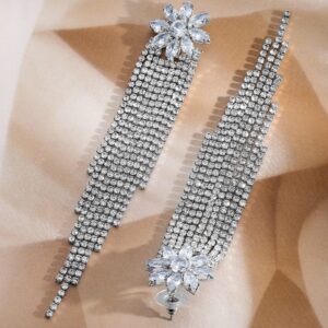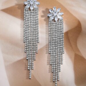 Earrings : These Rhodium-Plated Cubic Zirconia Floral Dangle Earrings feature a delicate floral design adorned with sparkling cubic zirconia stones, creating a sophisticated and elegant look perfect for any occasion. Occasion : Bring your style to a whole new level with this handcrafted piece of jewellery. When you’re celebrating a special Occasion : – a birthday, wedding, or personal milestone – this piece adds that extra something that makes us feel special and looking our best. Material : & Care Dimension : Length : 11.9 cm, Width: 1.9 cm Net Weight: 19.97 g Net Quantity : 1 Pair Of Earrings Material :Brass Care Label : It is advisable to avoid contact with water and organic chemicals i.e. perfume sprays. Store jewellery in airtight box. After use, wipe the jewellery with soft cotton cloth.