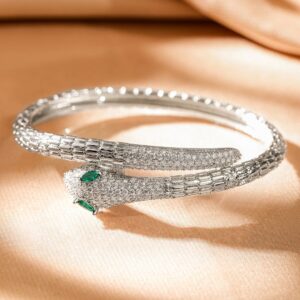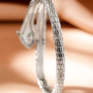 Bracelet : Make a bold statement with the 22K Gold-Plated cubic zirconia studded Snake Motif Bracelet. This luxurious accessory features exquisite white enamel detailing, an intricately designed snake head adorned with shimmering cubic zirconia, and an emerald-green accent for a captivating finish. Occasion : Bring your style to a whole new level with this handcrafted piece of jewellery. When you’re celebrating a special Occasion : – a birthday, wedding, or personal milestone – this piece adds that extra something that makes us feel special and looking our best. Material : & Care Dimension : Length : 3.3 cm Material :Brass Net Weight: 19 Gram Net Quantity: 1 Bracelet Care Label : It is advisable to avoid contact with water and organic chemicals i.e. perfume sprays. Store jewellery in airtight box. After use, wipe the jewellery with soft cotton cloth.