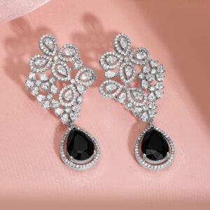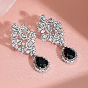Earrings : Elegant rhodium-plated drop earrings featuring sparkling cubic zirconia and bold black AD stones. A perfect blend of sophistication and style for every jewelry lover. Occasion : Bring your style to a whole new level with this handcrafted piece of jewellery. When you’re celebrating a special Occasion : – a birthday, wedding, festive or personal milestone – this piece adds that extra something that makes us feel special and looking our best. Material : & Care Dimension : Length : 6.5 cm, Width: 3 cm Net Weight: 15g Net Quantity : 1 Pair Of Earrings Material :Brass Care Label : It is advisable to avoid contact with water and organic chemicals i.e. perfume sprays. Store jewellery in airtight box. After use, wipe the jewellery with soft cotton cloth.