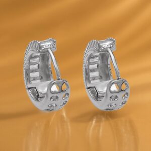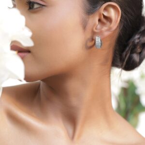 Earrings : rhodium-plated curved half-hoop earrings, adorned with dazzling Cubic Zirconia for a graceful and modern look, perfect for daily wear, parties, and special celebrations. Perfect for All Occasions: Ideal for daily wear, parties, festive looks, and gifting. Material : & Care Dimension : Length : 1.5 cm, Width: 0.5 cm Net Weight: 8.20 Gram Net Quantity : 1 Pair Of Earrings Material : Brass Care Label : It is advisable to avoid contact with water and organic chemicals i.e. perfume sprays. Store jewellery in airtight box. After use, wipe the jewellery with soft cotton cloth.